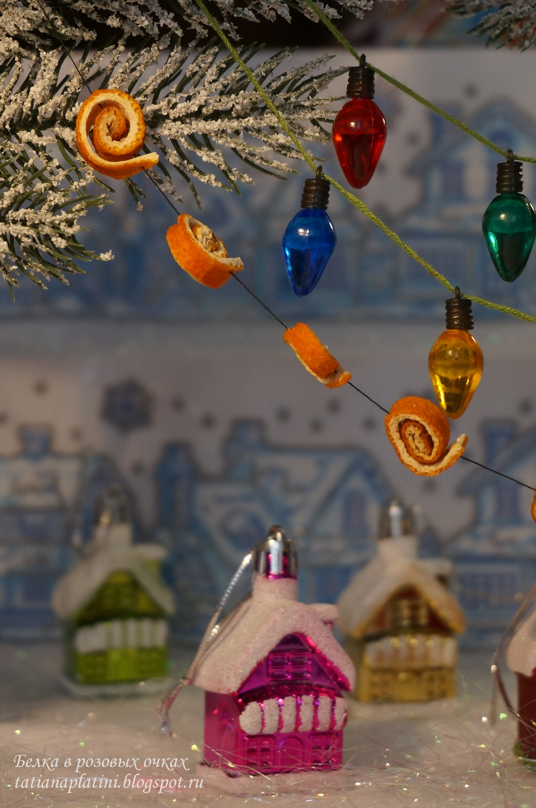 6. Танечка, восхищаюсь твоими домиками! Все выполнено так аккуратно, да еще идея с использованием геля с блестками, бисера, лампочек дополнительно украсила домик и придала ему особую неповторимость. Очень понравился венок из веток и гирлянда из апельсиновых или мандариновых (?) корок, захотелось и самой такой соорудить. В чайный домике так уютно все устроено, что хочется поселить там маленькую куколку или любую компанию игрушек-зверюшек.